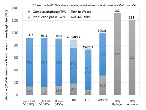 To move away from carbon-based fossil fuels, active discussions are ongoing regarding eco-friendly alternative fuels such as hydrogen, ammonia, biofuels, and e-fuels. Conventionally, GHG emissions from alternative fuels were evaluated base on a Tank-to-Wake (TtW) approach that accounted only for emissions during combustion. However, now the paradime is shifting toward assessing Well-to-Wake (WtW) GHG emissions based on Life-Cycle Assessment (LCA), which evaluates GHG upstream production through end-use. This shift implies that gray hydrogen or gray ammonia produced from fossil fuels will not be recognized as eco-friendly, and only green hydrogen (derived from renewable energy) or blue hydrogen (coupled with carbon capture, utilization, and storage—CCUS) will qualify as alternative fuels.