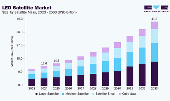 - Figure 2. Grand View Research, LEO Satellite Market Size, Share & Trend Analysis Report By Satellite Mass (Small Satellite, CubeSats, Medium Satellite, Large Satellite), By Frequency Band, By Propulsion Type, By Application, By End Use, By Region, And Segment Forecasts, 2025-2033. (https://www.grandviewresearch.com/industry-analysis/leo-satellite-market-report)