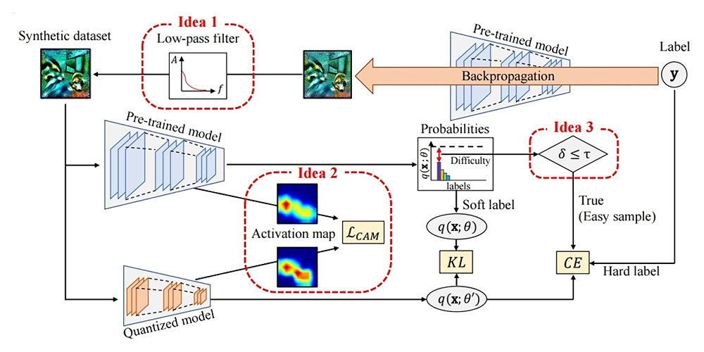 The research team enhanced model performance through three core techniques, overcoming the limitations of traditional ZSQ. First, they applied a low-pass filter to remove high-frequency noise from synthetic data. Second, they aligned Class Activation Maps (CAM) between pre-trained and quantized models to increase prediction accuracy. Lastly, they addressed potential errors caused by hard labels for difficult samples by using soft labels (probabilistically represented answers) instead, thus preventing faulty learning.