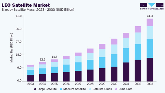 (우) Liou, J. C., and Tom Colvin. "US Space Debris Environment and Activity Updates." 60th Session of the Scientific and Technical Subcommittee/Committee on the Peaceful Uses of Outer Space, United Nations. 2023. - 그림2. Grand View Research, LEO Satellite Market Size, Share & Trend Analysis Report By Satellite Mass (Small Satellite, Cube Sats, Medium Satellite, Large Satellite), By Frequency Band, By Propulsion Type, By Application, By End Use, By Region, And Segment Forecasts, 2025 - 2033 (https://www.grandviewresearch.com/industry-analysis/leo-satellite-market-report)