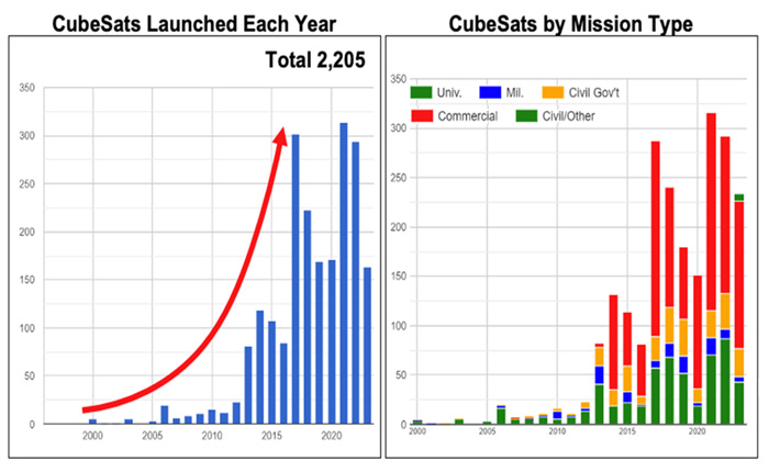 큐브 위성 개념이 정립된 후, 2003년에 6기의 큐브 위성이 처음 발사되면서 본격적인 큐브 위성 시대가 열렸다. 이른바 1세대 큐브 위성을 기점으로 시장이 형성되었고, 기술은 빠르게 발전하였다. 플랫폼의 상업화가 이루어지면서 교육적 목적을 넘어 연구, 군사, 상업 분야로까지 활용 범위가 확장된 것을 그림 2에서 볼 수 있다(Swartout, 2024). 특히 2010년 전후로 큐브 위성군을 활용한 임무가 본격적으로 등장했는데, 대표적인 사례로는 과학 임무를 위한 QB50 프로젝트, 상업적 목적의 Planet Labs 위성군, 그리고 기술적 진보를 보여준 MarCO와 Artemis 1 큐브 위성이 있다.