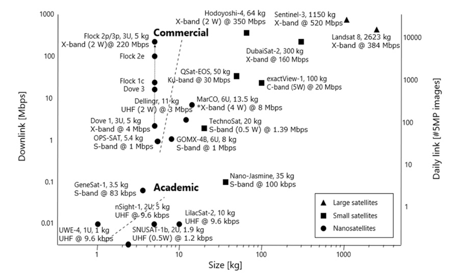 반면 큐브 위성은 발사 비용이 1기당 수억 원 수준이고, 짧은 운용 주기를 전제로 위성을 더 낮은 궤도에 투입할 수 있어 비교적 고해상도의 시계열 데이터 확보가 가능하다. Planet Labs는 큐브 위성의 이러한 장점을 활용해 지구 관측 데이터의 상업화를 본격화했다. 2013년 4기의 3U 큐브 위성을 시범 운용한 뒤, 28기의 위성을 추가 발사하여 서비스를 시작했다. 당시 3U 큐브 위성으로 3~5 m 급 영상을 촬영했는데, 이는 2012년 비슷한 시기에 발사된 약 1톤 규모 아리랑 3호 위성(70cm 급 해상도)에는 미치지 못했지만, 개발·발사비가 수천억 원에 달하는 대형 위성과 비교했을 때 효율성이 압도적이었다. 더불어 큐브 위성 최초로 X-band 통신을 도입하는 등 여러 기술적 성과(Weston, 2025)를 남겼으며, 준실시간 영상 확보 능력과 최근의 영상 보간 기술(Kong, 2023) 발전은 지구 관측 임무에 새로운 전환점을 마련했다.