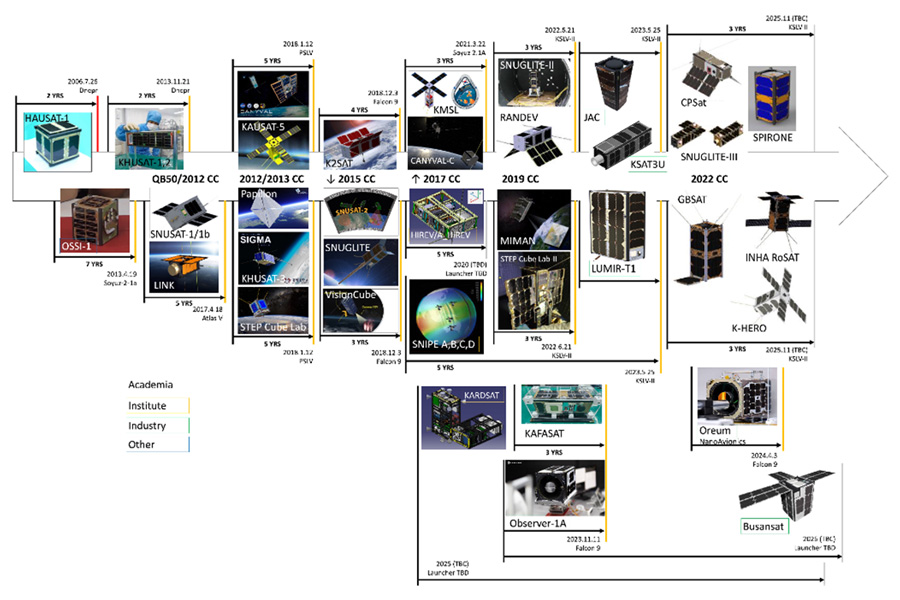 우리나라의 큐브위성 활동은 2000년대 초반으로 거슬러 올라간다. 한국항공대학교가 우리나라 최초의 큐브위성 HAUSAT-1을 개발한 것을 시작으로, 세계 최초의 개인 큐브위성 OSSI-1, 경희대학교의 KHUSAT 시리즈 등이 뒤를 이었다.