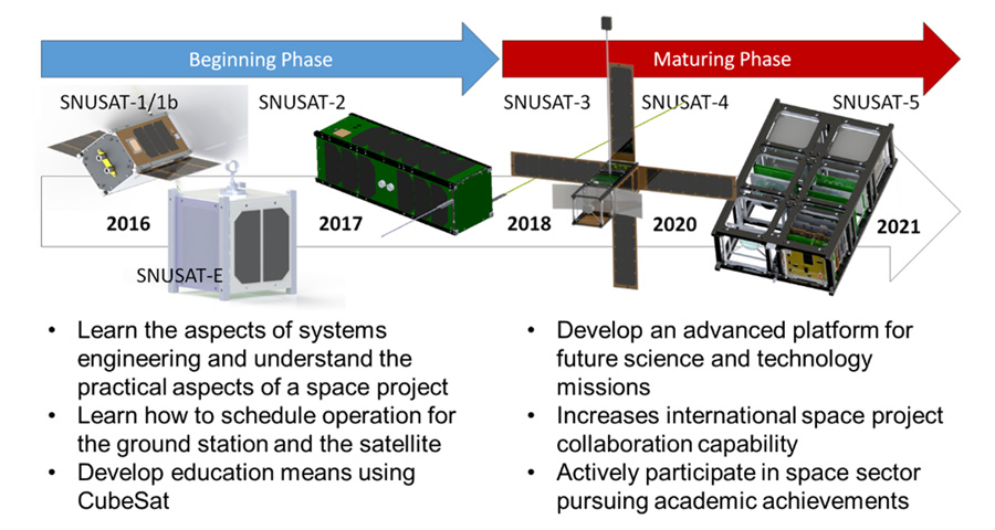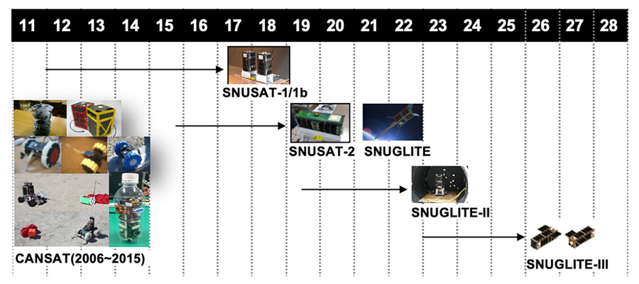 서울대학교는 2006년 일본 도쿄대학교와 공동으로 ARLISS 캔위성 국제대회에 참가하며 학생 세 명을 파견한 것을 계기로 캔위성 교육 프로그램을 시작했다. 이후 2011년 QB50 프로젝트 참여를 계기로 2012년부터 본격적인 큐브 위성 제작에 착수하여, 지금까지 SNUSAT-1/1b(2기), SNUSAT-2, SNUGLITE 시리즈(4기) 등 총 7기의 큐브 위성을 개발해 왔다(그림 5). 이 과정에서 학생들은 임무 설계·개발·운영의 전 주기를 경험하며 시스템 엔지니어링 역량을 축적할 수 있었다. 서울대학교 큐브 위성 프로그램은 처음부터 교육 단계와 연구 단계를 연속적으로 발전시키는 구상(그림 6)을 바탕으로, 교육용 플랫폼에서 출발해 연구용 플랫폼으로 확장해 나가고 있다.