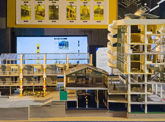 학기 말이 되어 건물의 최종 형태가 확정된 후, Rhino로 만든 가상의 건물을 Twinmotion 프로그램7)으로 옮겨와 렌더링(rendering)8) 작업을 진행하여 이미지를 생성했습니다. 특히, 해당 프로그램에서 제공되는 영상 제작 기능을 통해 홍보 영상을 제작하여 전시에 활용하였습니다. 이렇게 제작된 이미지와 영상은 건축학과 전공자가 아닌 일반인 또한 쉽고 빠르게 건물의 용도와 형태를 이해할 수 있도록 도와줍니다.