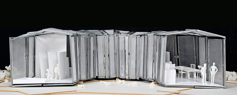 건축공학 전공자는 4학년 1학기에 3인 프로젝트로 졸업 설계를 진행합니다. 팀원들은 각각 구조설계(Structural Design), 환경설계(Environmental Design), 건설관리(Construction Management)를 담당하여 해당 주제를 어떻게 공학적으로 구현해낼지 고민합니다. 1학기 종강 이후, 한 학기 동안 발전시켜온 내용을 정리하여 포스터로 제작합니다. 포스터 앞쪽에는 이해를 돕기 위한 모델, 영상 등을 배치합니다. 건축공학 분야 전시는 건축학 분야 전시와는 다르게 팀별로 원하는 주제를 자유롭게 정할 수 있습니다. 예를 들어, 이번 졸업 전시에서는 '재난 상황을 대비한 오리가미 구조의 주거 형태'(그림4), '사우디아라비아의 기후 조건을 고려한 지속 가능 아파트'(그림5) 등의 주제가 있었습니다.
