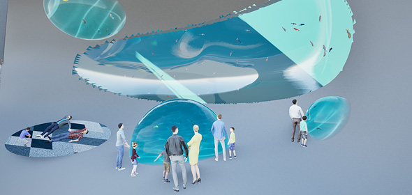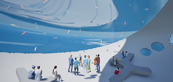 다음으로, 저희 팀이 출품한 작품을 예시로 들어 건축학과 학부생의 프로젝트 진행 과정을 조금 더 자세히 알려드리고자 합니다. 프로젝트의 주제는 '울릉도4)해저 아쿠아리움 및 호텔 건설 사업'이었습니다. 해당 프로젝트는 기존의 아쿠아리움들이 해양 생물의 생활 환경을 고려하지 않고 있다는 문제의식에서 출발했습니다. 좁은 수조에 해양 생물을 가두고 관찰하는 인간 중심적 방식에서 벗어나, 그들의 터전에 인간이 직접 찾아가자는 아이디어를 제시하였습니다. 해당 아이디어를 드로잉으로 표현하고, Rhino 프로그램5)을 이용한 3D 모델링(Modeling)6)으로 구체화하는 작업을 여러 번 반복했습니다.