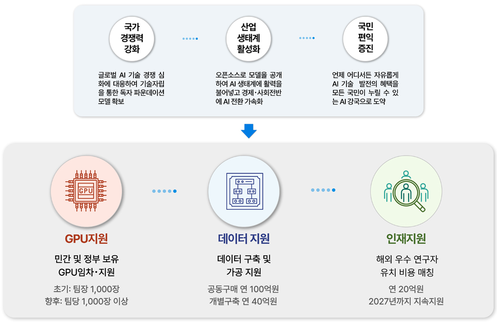 2025년 6월, 정부는 국가 주도 인공지능 전략의 필요성을 강조하며 '독자 AI 파운데이션 모델' 프로젝트를 공식화했다. 과학기술정보통신부, 정보통신산업진흥원 등 여러 기관이 협력해 기획한 이 사업은 초기 2,000억 원의 예산을 투입하고, 장기적으로는 100조 원 규모까지 확대하겠다는 청사진이 제시되었다. 목표는 2026년 말까지 글로벌 빅테크와 격차를 줄이고, 한국어와 한국 산업 맥락에 특화된 고성능 파운데이션 모델을 확보하는 것이다.