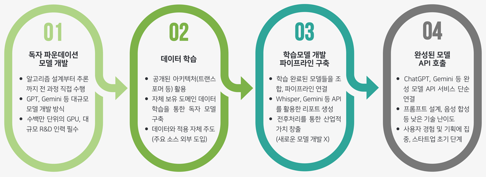 이른바 독자 AI 파운데이션 모델이란, 알고리즘을 설계하고 데이터를 수집·정제한 뒤 방대한 학습과 검증, 그리고 추론까지 전 과정을 스스로 수행해야 비로소 의미를 갖는다. GPT, Gemini, Claude 같은 LLM이나 Whisper, SAM 등 거대 모델이 모두 이런 방식으로 만들어졌다. 이 단계에는 수백에서 수천만 단위의 GPU 연산 자원, 고유한 데이터셋, 그리고 이를 떠받칠 연구 개발 인력이 필요하며, 사실상 Google이나 OpenAI 같은 글로벌 빅테크 기업만이 감당할 수 있는 수준이다. 그래서 많은 기업이 실제로 접근하는 방식은 그보다 한 단계 아래에 존재한다. 이미 공개된 아키텍처와 알고리즘을 활용하고, 자체 데이터를 학습시켜 자신들의 모델을 만드는 것이다. 트랜스포머, U-Net, LSTM 같은 구조를 가져와 자사 도메인 데이터에 맞게 학습시키는 경우가 대표적이다. 핵심 기술은 일부 외부에 의존한다고 볼 수 있지만, 데이터와 적용을 자체적으로 주도한다는 점에서 독자성을 확보하려는 시도라 할 수 있다. 또 다른 접근은 이미 학습이 끝난 모델을 가져다 파이프 라인을 조립하는 방식이다. Whisper로 음성을 텍스트로 변환한 뒤 Gemini로 요약을 하고, 이를 PDF 리포트로 만드는 식이다. 모델을 새로 만드는 것은 아니지만, 전처리와 후처리를 엮어 산업 현장에 적합한 결과물을 만들어낸다. 마지막은 ChatGPT나 Gemini API처럼 완성된 모델을 단순히 호출해 서비스에 붙이는 방식이다. 프롬프트를 설계하거나 음성 합성 API를 연결해 서비스에 얹는 정도다. 기술적으로는 가장 단순하지만, 사용자 경험과 기획 차원에서는 여전히 의미가 있다. 실제로 많은 스타트업이 초기 제품을 이 단계에서 출발시킨다.