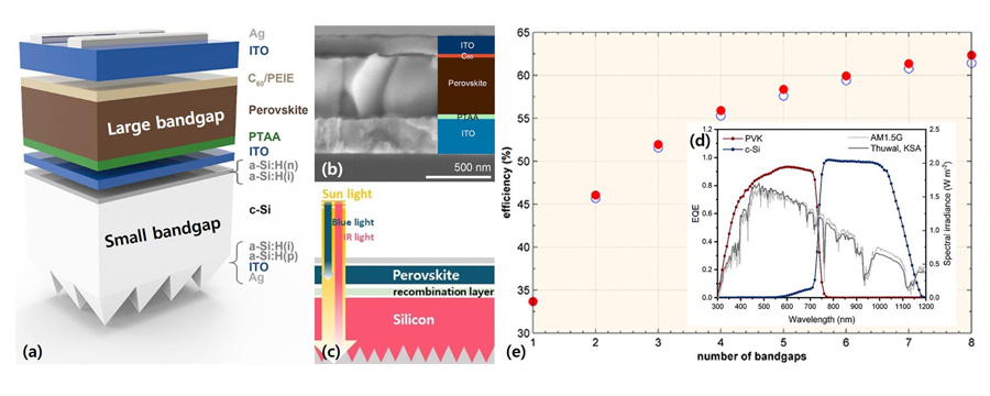 이처럼 낮은 에너지밀도를 개선할 유일한 방법은 태양전지의 변환 효율을 극대화하는 것인데, 태양전지는 한계 효율인 33% 이상의 변환 효율을 가질 수 없음이 이론적으로 보고된 바 있다.1) 상용 실리콘 태양전지의 경우, 실험실 수준의 소자에서는 이미 이론적 한계 효율에 접근하고 있기 때문에 에너지밀도 향상 속도가 느리고 추가되는 비용이 급격히 증가하는 문제를 가지고 있다. 이러한 문제를 해결하기 위해 현재 전 세계적으로 탠덤 태양전지 기술이 활발하게 개발되고 있다.2) 탠덤 태양전지는 두 개 이상의 서로 다른 밴드갭 에너지를 가지는 태양전지를 직렬로 적층하여 제작되는데, 각 태양전지가 각자의 밴드갭 에너지에 적합한 파장의 태양빛을 선택적으로 흡수하여 잉여 에너지가 열로 손실되는 thermalization 손실을 최소화할 수 있고, 결과적으로 태양전지의 이론적 한계 효율이 높아지게 된다. 예를 들어, 한 종류의 물질로 이루어진 태양전지는 최대 33% 효율을 가질 수 있지만, 두 종류의 물질을 조합할 경우 46%까지 가능하고, 물질의 수를 계속 늘려가면 이론적으로는 60% 이상의 변환 효율도 가능해지는 것이다 (그림1).