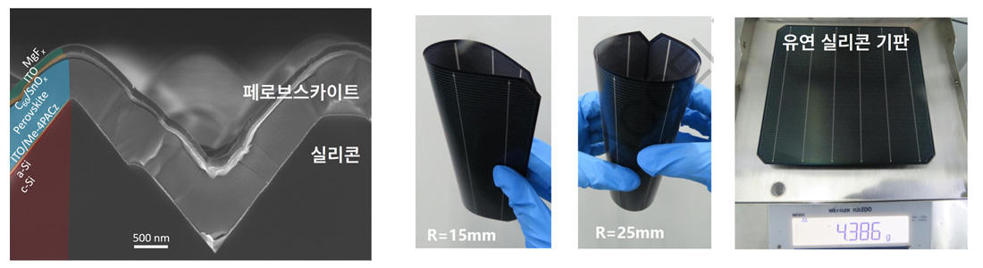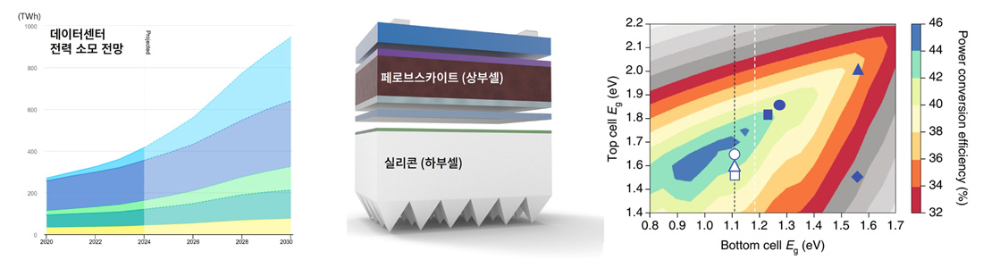 문제는 에너지밀도, 즉, 면적당 발전 효율이다. 현재, 대부분의 태양광 발전은 실리콘이 빛을 흡수하는 광흡수층으로 사용되는데, 이와 같이 실리콘 단일 소재를 사용하는 태양전지는 이론적으로 30%의 발전 효율을 넘을 수 없다. 이미 실리콘 태양전지는 기술 성숙도가 매우 높아 효율 증대를 기대하기 어렵다. 발전량을 늘리려면 설치 면적이 증가해야 한다는 의미이다. 따라서, 건물 일체형 태양광(building-integrated photovoltaic, BIPV)이나 차량 탑재용 등 설치 면적이 제한된 곳에 적용하기에 한계가 명확하다. 우리나라나 일본처럼 국토 면적이 좁고 일사량이 높지 않아 태양광 발전이 용이하지 않은 나라에서는 면적 대비 발전 효율을 극대화하는 것이 필수적이다. 이는 태양광 산업의 경제성과도 직결된다.