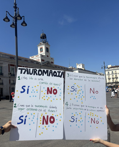 SNU in Madrid에서는 어학 강의와 현지 강연뿐만 아니라 조별 과제를 통해 스스로 원하는 주제를 주체적으로 탐구할 기회도 주어집니다. 저희 조는 "스페인의 투우 문화와 동물권"을 주제로 선정하여 실제 스페인 국민의 인식을 조사해보았습니다. 직접 마드리드 광장에 나가 설문조사를 진행하고, 투우장을 방문하여 인터뷰를 시도하는 등 익숙하지 않은 환경 속에서 스스로의 한계를 깨부수는 경험을 할 수 있었습니다.
